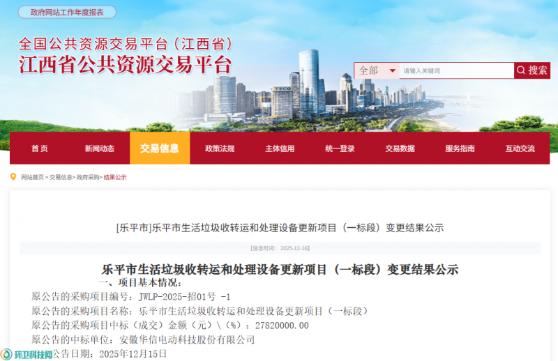 環(huán)衛(wèi)科技網(wǎng)12月16日從江西省公共資源交易平臺獲悉,因原中標(biāo)人無法履約被視為自愿放棄中標(biāo)資格,樂平市生活垃圾收轉(zhuǎn)運(yùn)和處理設(shè)備更新項(xiàng)目(一標(biāo)段)變更中標(biāo)結(jié)果。